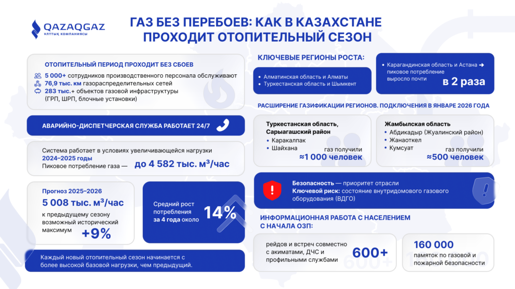 Отопительный сезон в Казахстане традиционно становится проверкой на прочность для всей газовой инфраструктуры страны. Протяжённая территория, суровые зимы и ускоряющаяся газификация регионов делают устойчивость газоснабжения вопросом системного управления, передает агентство Kazinform со ссылкой на АО «НК«QazaqGaz».